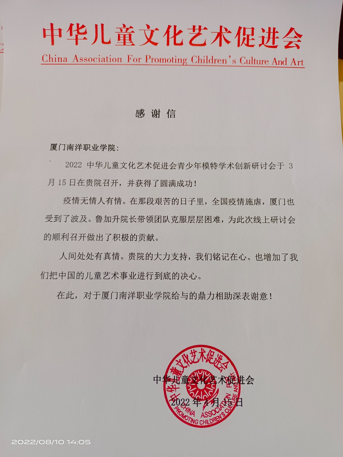 近日,我校收到了一封来自中华儿童文化艺术促进会的感谢信。信中表示,在厦门全力抗击疫情的关键时刻,厦门南洋职业学院挺身而出,抽调精干力量筹备策划“中华儿童文化艺术促进会青少年模特学术创新研讨会”,在短时间内高质量完成研讨会众多事宜,确保研讨会如期进行,用实际行动彰显了高校的责任担当和优良作风。
