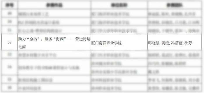 参赛教师们以“勤奋求实、拼搏向上”的南洋精神,刻苦备赛、团结协作,最终我校艺术设计学院黄少雄、李喆靓、林铭锋三位老师与泉州市文物保护研究中心姚洪峰教授作品《古景新韵-乡村环境综合整治提升方案设计》在高职组类别中斩获专业课程二组三等奖;经济管理学院/三创学院邱晓慧、黄澄、冯蓓蓓、杜芳四位老师的作品《助力“金砖”,服务“海西”——营运跨境电商》在高职组类别中斩获专业课程一组三等奖。