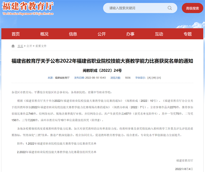 近日,福建省教育厅公布《福建省教育厅关于公布2022年福建省职业院校技能大赛教学能力比赛获奖名单的通知》,我校代表队在高职类别中斩获专业课程组2项三等奖。