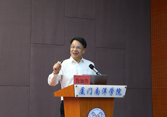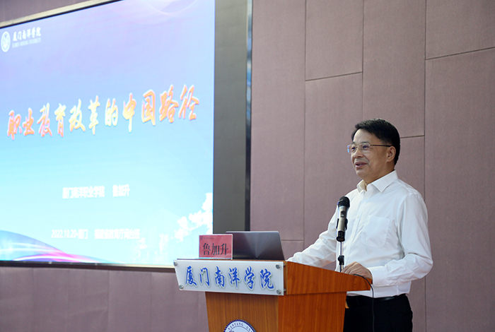 在仙岳报告厅,鲁加升教授为研修班成员作“职业教育改革的中国路径”专题授课。他用生动的语言、精选的案例、独特的视角,围绕职业教育改革的中国背景、中国路径以及厦门南洋职业学院的改革探索三个方面,系统阐述了中国职业教育改革的文化背景、面临现状、政策支持、中国模式等内容。他表示,要走出一条具有中国特色的职业教育改革道路,需要在相互借鉴、相互学习的基础上融合出一套具有学校自身特色的发展模式。同时,他以厦门南洋职业学院在改革方面进行的实践探索及取得的成绩为例,多维度、多视角地阐明了要理念创新、教育模式创新、体制机制创新,建设高质量的职教师资队伍,着重打造和培育高素质“双师型”教师队伍。