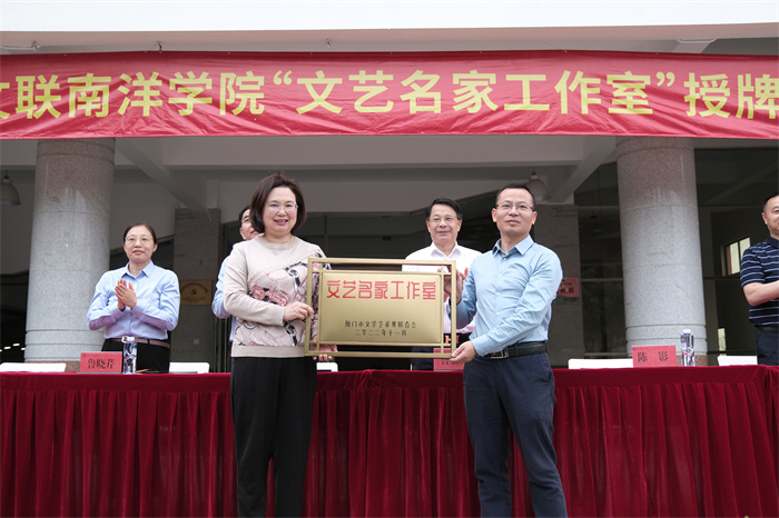 厦门市文联党组书记、副主席陈影向厦门南洋职业学院授予厦门市文联“文艺名家工作室”牌匾。