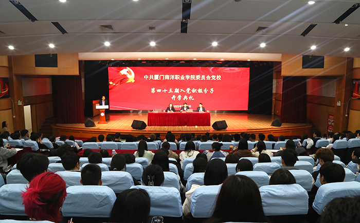 3月29日,厦门南洋职业学院第四十三期党校开班仪式在活动中心礼堂举行。党委书记施水成,党委委员鲁晓芹、李振杰、蓝德森,第四十三期入党积极分子及部分党员代表参加。党委委员、党校副校长李振杰主持开班式。