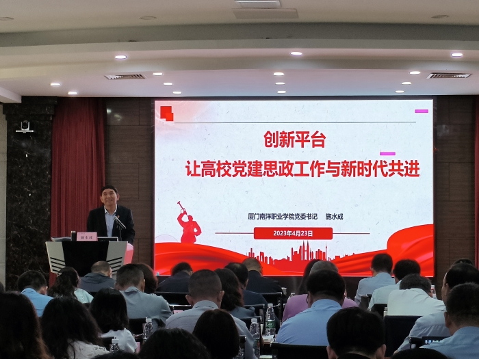 施书记结合自身三十多年党建思政工作感悟,以厦门南洋职业学院创新党建思政工作的实践为例,具体阐述了学校“创设学工微信平台,让党建时刻在线”“创建公寓党组织,让党建‘走进’学生宿舍”“创立党委教师工作部,让党建引领教师发展”“创新红色教育平台,让党建传承红色基因”“创建勤工助学平台,让党建提升育人成效”“创建省级文明校园,让党建提升立德树人水平”这六大党建平台创新之举。他表示学校党委以南洋学院办学特色为出发点,深挖南洋党建优势,打造南洋党建品牌,创新工作平台,将思想政治引领与教育教学实践有机结合,着力师生思政工作一盘棋,构建全员育人体系,推动学校健康发展,促进学生成长成才。