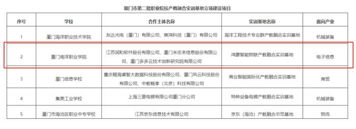 近日,厦教办〔2023〕101号《厦门市教育局办公室关于公布厦门市第二批职业院校产教融合实训基地立项建设项目的通知》公布,厦门南洋职业学院鸿蒙智能物联产教融合实训基地入选厦门市第二批职业院校产教融合实训基地立项建设项目。