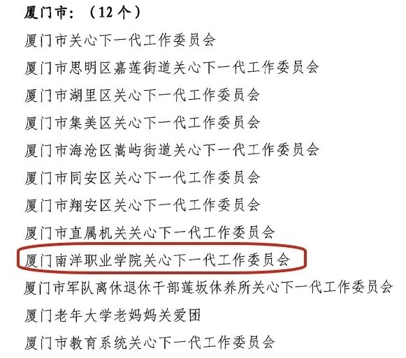 近日,福建省关心下一代工作委员会下发《关于表扬全省关心下一代工作突出成效奖 突出贡献奖和特别贡献奖的决定》。厦门南洋职业学院关心下一代工作委员会被授予“全省关心下一代工作突出成效奖”荣誉称号,是福建省唯一获评民办高校!
