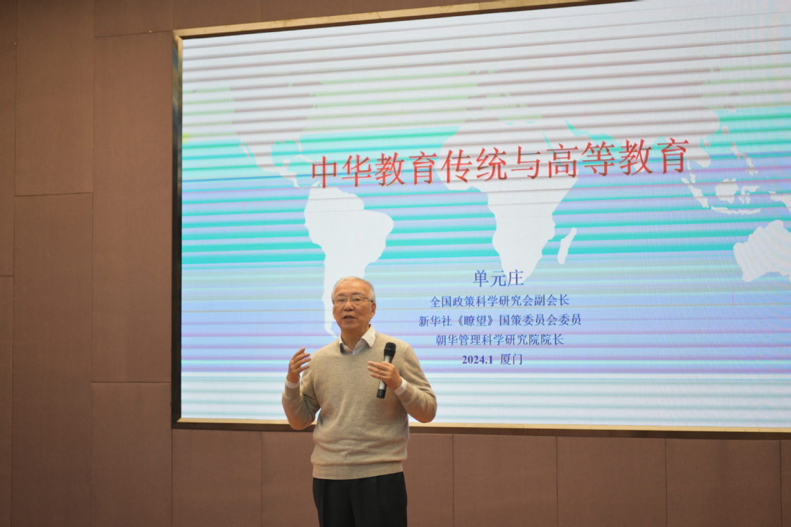 在“中华优秀传统与高等教育”部分,单元庄讲述了中华教育优秀传统案例和以培育具有“天下情怀+治世长技”的国家治理英才为宗旨的中华民族国家的 “社会上层再生产”的中华教育本质。他认为,中华优秀高等教育,是中华民族国家改朝换代而不亡国,罹难衰微而能够再度崛起的中流砥柱。单元庄详细讲解了中华高等教育简史,指出近现代教育史呈现“组织人格化规律”,高等教育塑造的青少年价值观会大概率决定家国命运,所以在建设“中国式现代化”征程中要坚持传承弘扬创新原则,以“人类命运共同体”“天下为公”的目标价值追求作为中国高等教育的主导思想,遵循“组织人格化规律”“青少年价-智结构代际转化规律”“教育链分责共塑规律”,回归教育本质,培育家国人才。