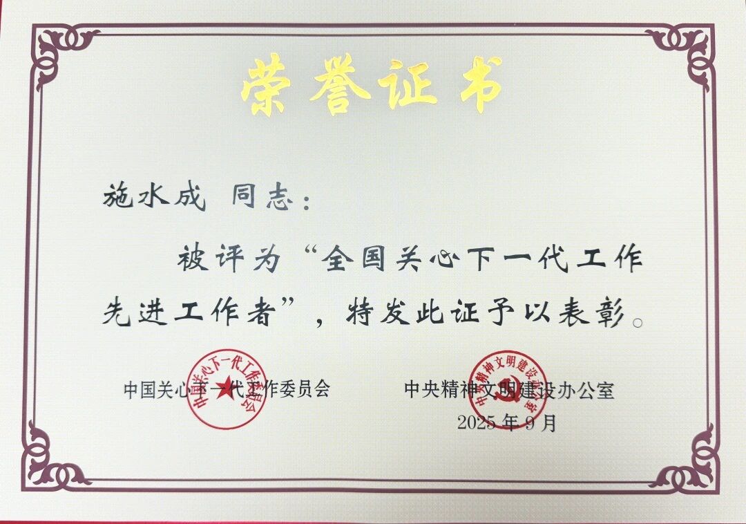 此次荣获国家级表彰,既是对施水成同志个人工作的肯定,更是对我校关工委工作的激励。我校始终坚持“党建带关建”,推动成立由校领导、退休干部、骨干教师组成的关工委工作队伍,创新举办“爱生节”等特色活动,让关工委成为凝聚育人力量的重要平台。