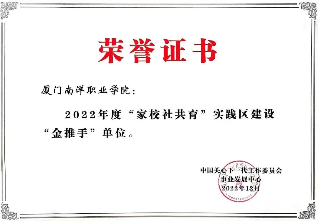 厦门南洋学院获2022年度“家校社共育”实践区建设 “金推手”单位
