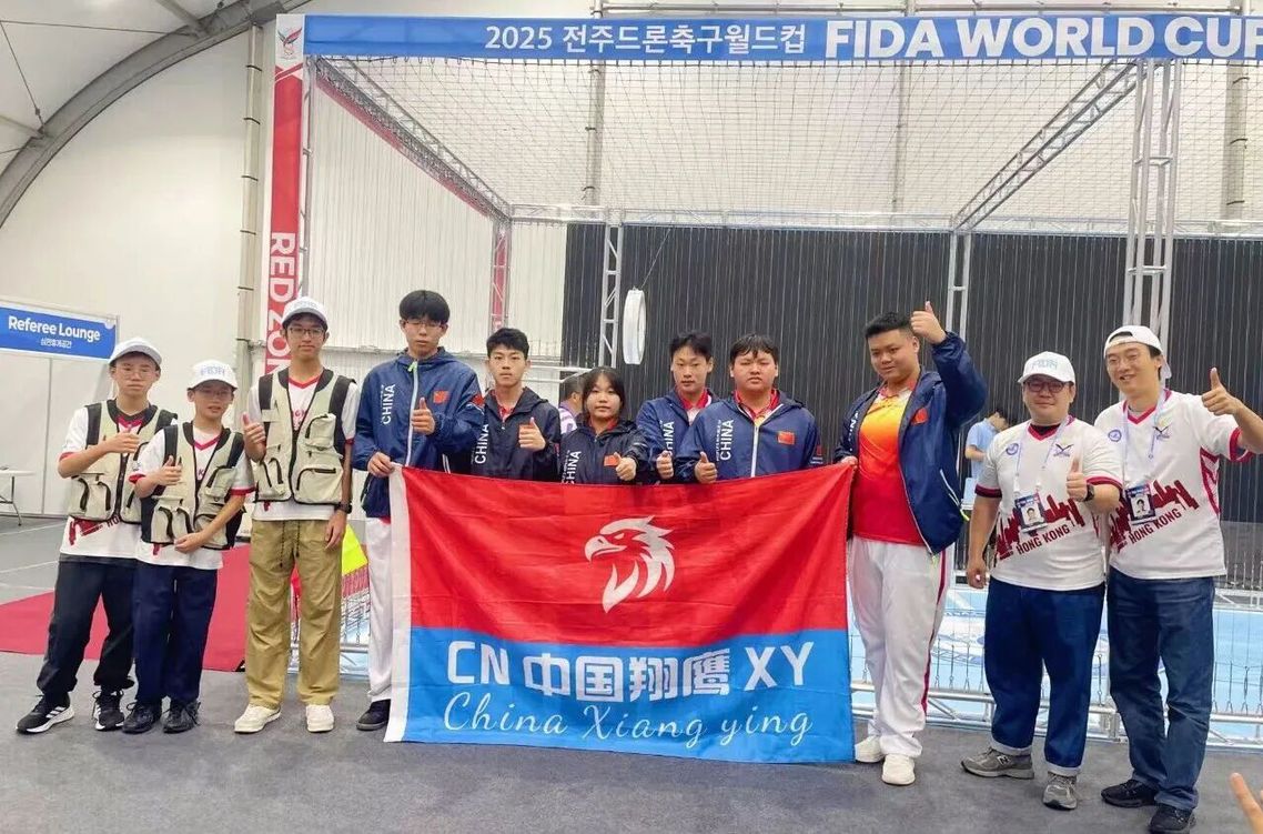 图为中国翔鹰(南洋)无人机足球队与中国香港队合影