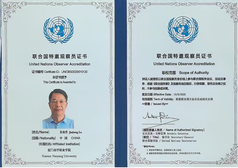 此次当选联合国特邀观察员,不仅是对鲁加升教授个人影响力与国际视野的高度认可,更是厦门南洋学院的一份责任。学校将积极发挥优势,进一步加强国际交流与合作,为师生创造更多参与国际项目和活动的机会,培养学生的全球视野和国际竞争力,为促进国际间的交流与合作、推动全球教育事业的发展贡献南洋力量。