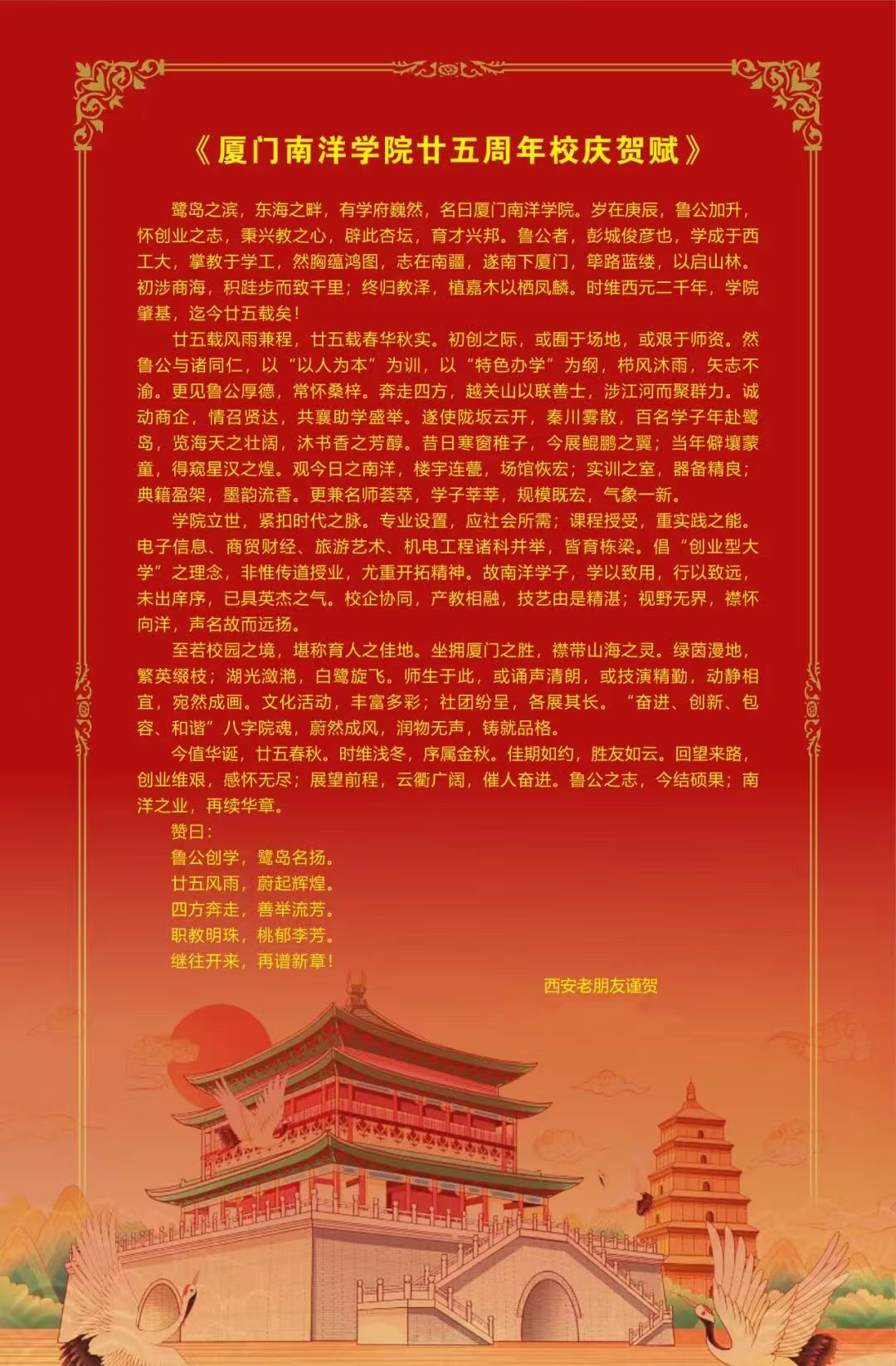 25周年校庆来临之际,我校欣获贺赋一篇。文辞典雅,情透纸背,字里行间满载着历久弥坚的深厚情谊,亦折射出对厦门南洋学院“立德树人,桃李芬芳”教学硕果的由衷赞誉。这份情谊与肯定,正是对校庆的诚挚献礼。