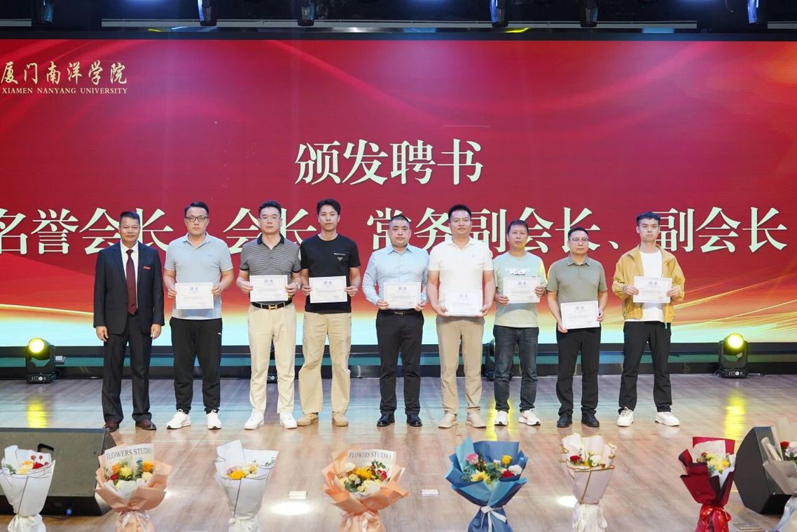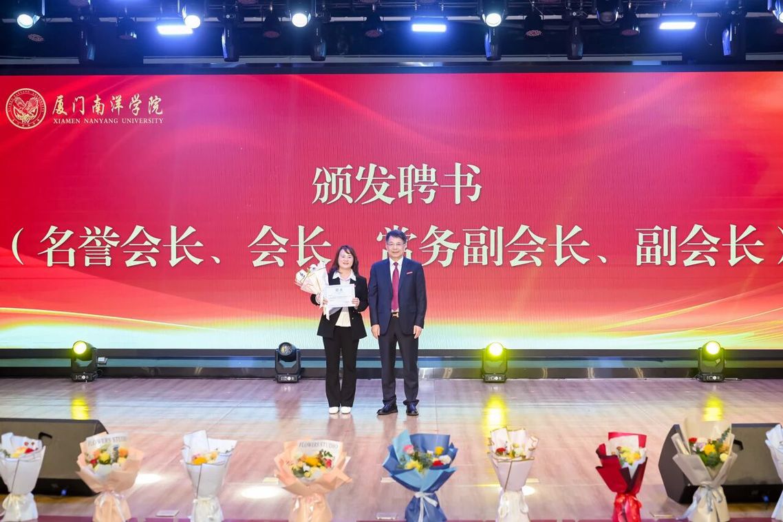 我校创办人、南洋教育投资董事长鲁加升教授为新一届名誉会长、会长、常务副会长颁发聘书,副校长蓝德森为新一届副会长颁发聘书。