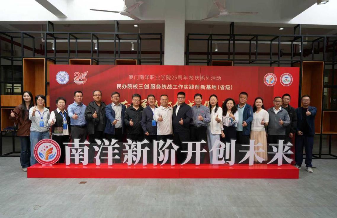 南洋新阶基地作为省级实践创新基地,基地内举办的25周年校庆“新阶成果展”吸引了考察团的目光。展览结合实物、图文、视频等形式,生动展示了基地在新的社会阶层人士培养、服务地方经济发展以及推动“三创”教育方面取得的丰硕成果。从优秀校友的创业故事到师生共创的科技项目,每一项成果都彰显了厦门南洋职业学院在凝聚新阶力量、赋能青年成长方面的卓越成效。