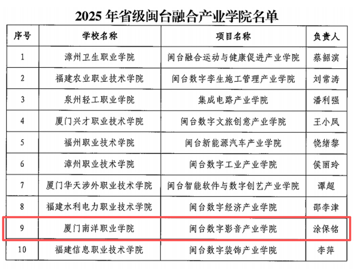 我校涂保铭老师牵头的“闽台数字影音产业学院”成功入选2025年省级闽台融合产业学院名单,这是对学校积极探索校企协同、两岸协同育人模式的充分肯定,为闽台职业教育融合发展提供了可复制、可推广的实践范本。