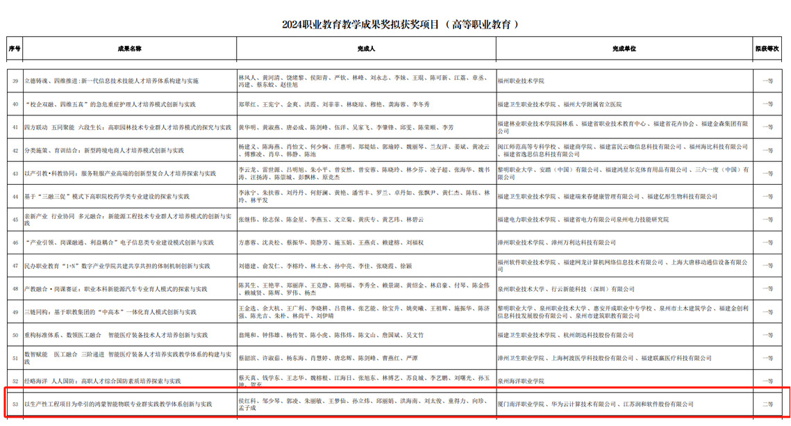 在2024年职业教育教学成果奖获奖项目中,我校信息工程学院物联网应用技术专业群申报的《以生产性工程项目为牵引的鸿蒙智能物联专业群实践教学体系创新与实践》荣获2024年职业教育教学成果奖省级二等奖!
