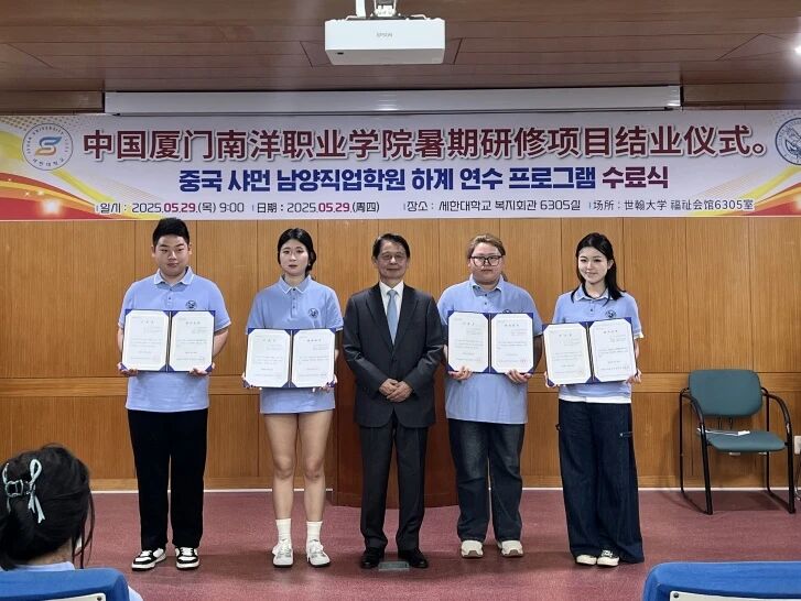 2025年5月29日,韩国世翰大学校长在研学结营仪式中为学生陈可卿(左二)颁发结业证书