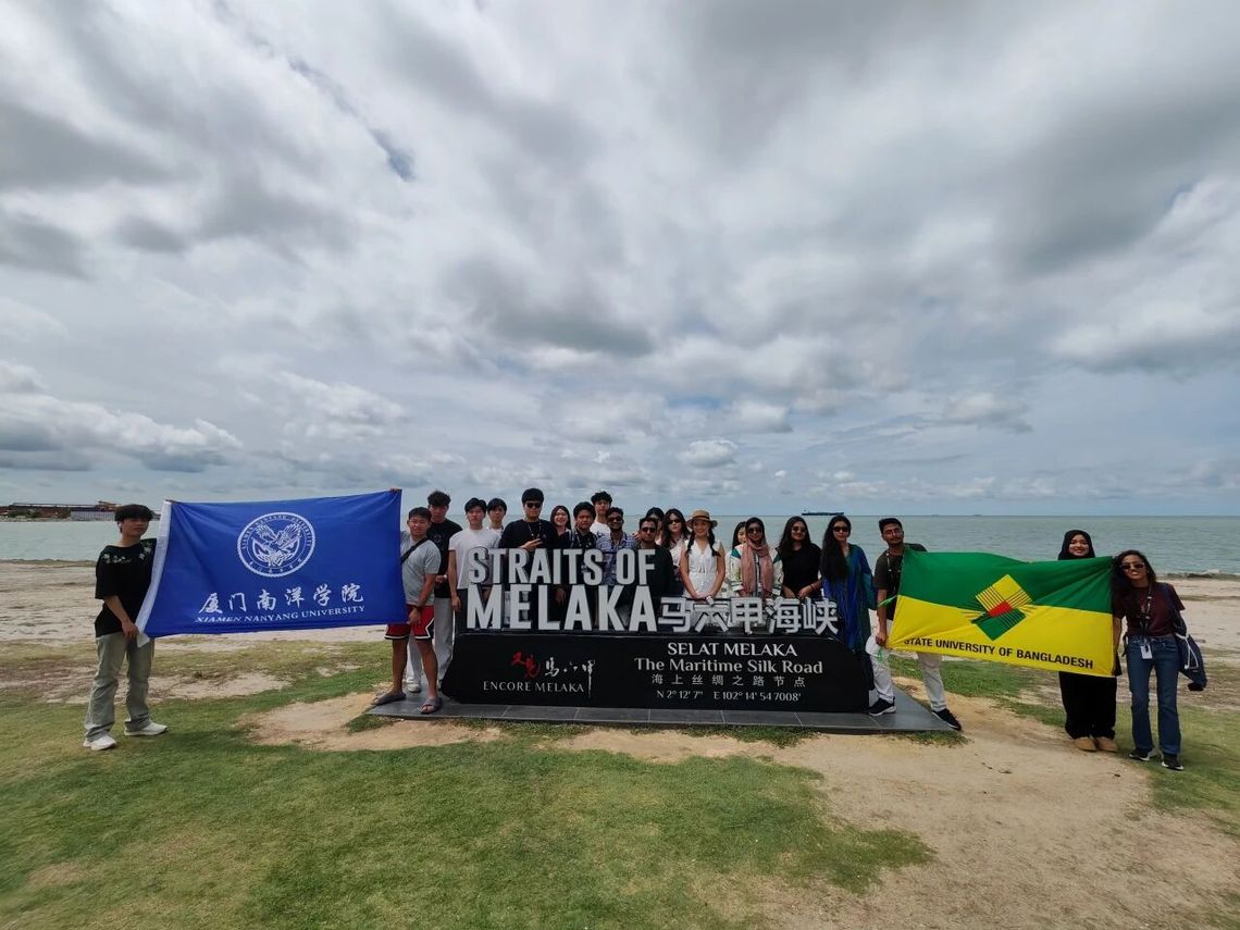 2025年10月25日,厦门南洋学院与孟加拉国国立大学研学学生在马六甲海峡地标合影