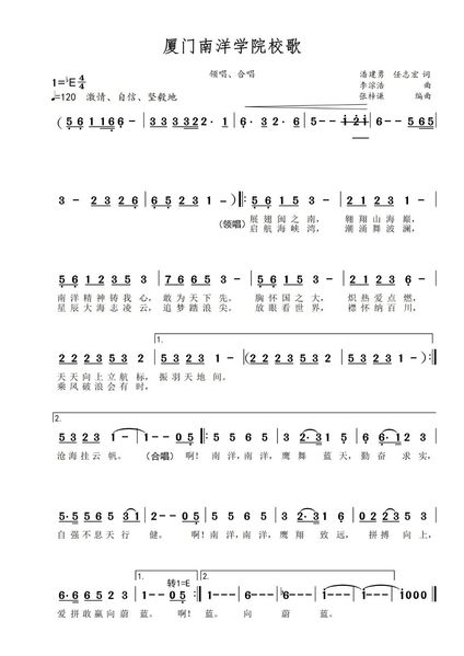 大学的精神看不见,却无处不在它是某个标志性建筑的轮廓是观音湖畔与天鹅的和谐共处是校训石碑上的刻痕更是每一个南洋师生言谈举止间所表现出来的独特气质而在所有文化符号中最直抵人心、凝聚共识的莫过于一首校歌当厦门南洋学院校歌响起熟悉的旋律在每一个师生心中奏响了关于理想、责任与归属的同一段和弦一起重温校歌带来的感动——有人说归属感需要时间慢慢沉淀其实当旋律响起的那一刻归属已经发生未来的日子里愿校歌陪你走过清晨的林荫道伴你度过每一个为梦想奋斗的深夜让南洋精神在歌声中代代相传绽放更耀眼的文化自信与光芒!校歌创意校歌创意围绕南洋学院办学理念、校训、南洋精神、校徽“雄鹰”“航船”意象展开象征创意,与“校徽”构成南洋学院整体的“校园文化CIS形象体系”。第一段主歌,以“雄鹰展翅”意象,诠释“天天向上”之“南洋精神”、“爱与适合的教育”之理念;第二段主歌,以“航船启航”意象诠释南洋人“国际视野”“走向世界”之胸怀与气概;副歌,则集中凸显“勤奋求实,拼搏向上”之校训内涵,以升华校歌主题。校歌旋律采用大调式、4/4拍、中速稍快构想,前奏承接耳熟能详,闽南特色鲜明之南洋学院“代校歌”《爱拼才会赢》旋律模进,意在产