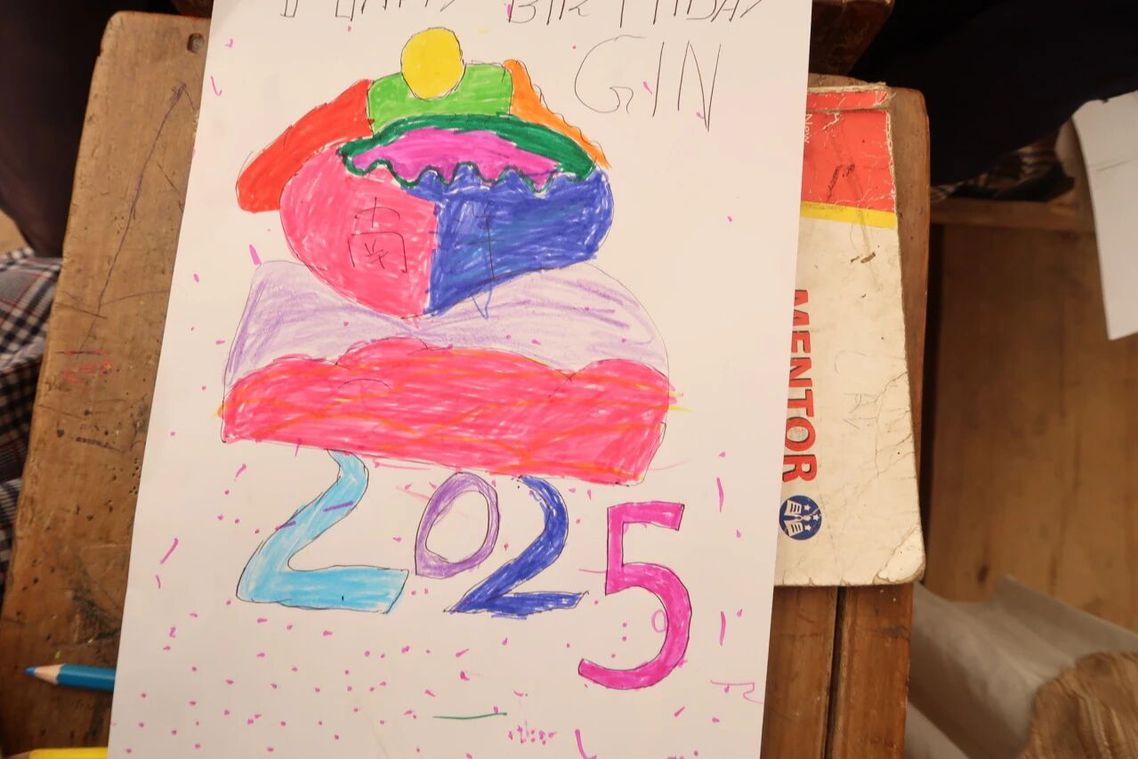 白纸上,五颜六色的蛋糕,2025年的标志,刚学会写的福字,孩子们把这几天王今教给他们的知识,都汇聚在了一张画纸上,蛋糕里,这是他们对厦门南洋学院25周岁的真挚祝福。这份纯真的祝福,跨越了千山万水,承载着孩子们对美好未来的向往。