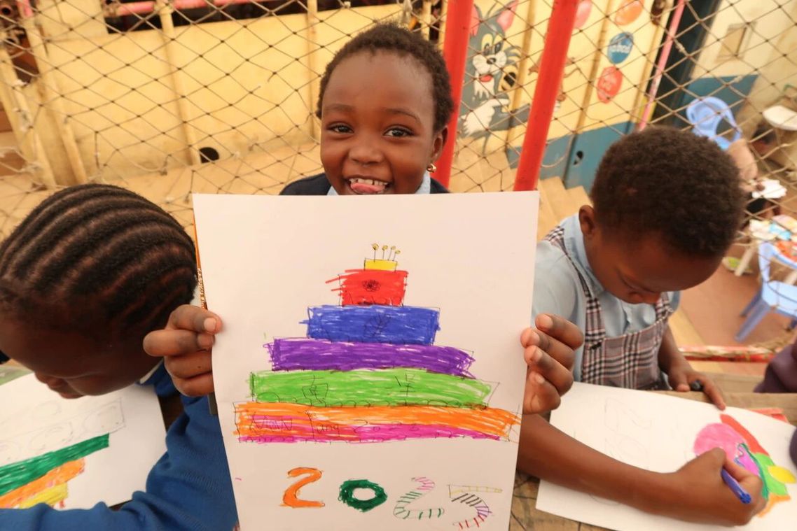 绘画课上,王今为孩子们准备了彩笔和白纸,让孩子们可以发挥自己的想象,画下他们的愿望,孩子们有的画披萨,有的画蛋糕。特别是蛋糕,孩子们非常喜欢,因为他们根本吃不上,所以蛋糕在他们心里是珍贵的、神圣的。自从听了王今的介绍,看了厦门南洋学院的图片和视频,孩子们在课堂上,用手中的画笔,绘制他们心中的蛋糕,说要送给王今工作的学校——厦门南洋学院一份生日礼物。